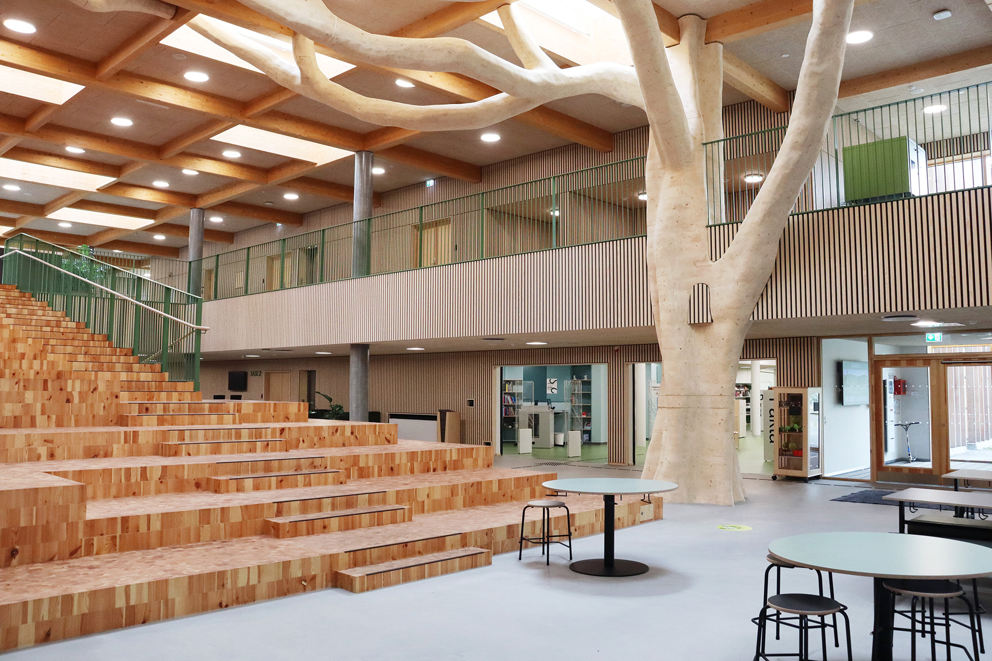 Kulturhuset bygger på en vision om et bæredygtigt og komplet økosystem for leg og læring, hvor naturen og skolen smelter sammen. I indgangshallen bliver de besøgende mødt af det store træ, der forgrener sig fra stueetagen, lige over for biblioteket, til resten af det 10.000 m2 store hus i to etager, der er tegnet af AART Architects.