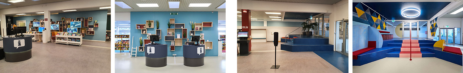 Rundt i hele biblioteket er der tænkt flotte vægfarver ind, folieløsninger og tæpper for at give hele huset et nyt liv. De flotte, farvede tæpper med nøje udvalgt mønstre, er med til at skabe et levende og inspirerende bibliotek og give den ”hjemlige” følelse af hygge, som også åbner områderne op og virker inviterende. Derudover indrammer flotte nye folier, små siddepladser i former og farver, akustikløsninger og en helt speciel belysning rum i rummet på en ny og levende måde.