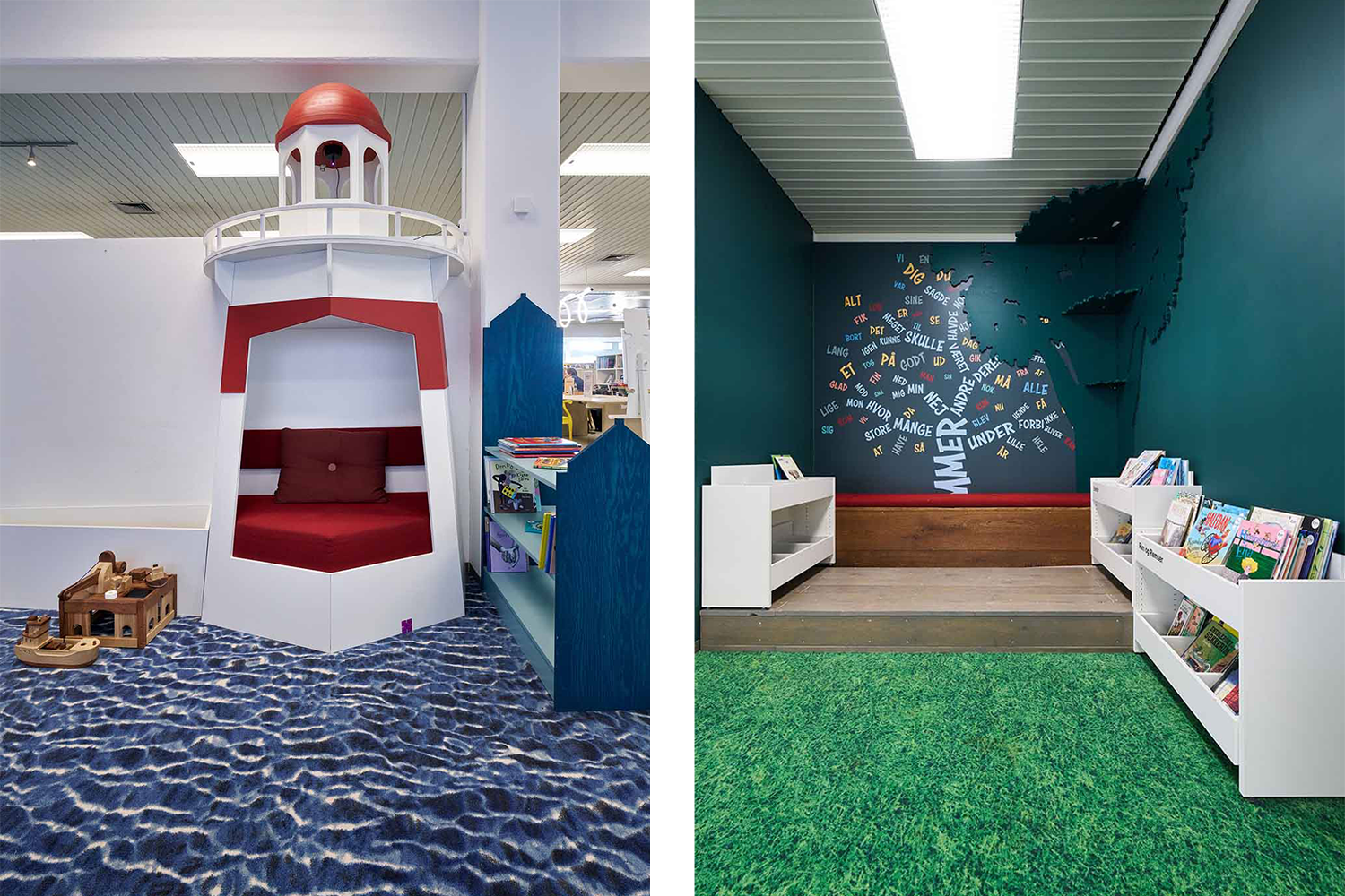 Ved indgangen til børneområdet har den blå trappe fået sig et farverigt flot løft, inspireret af farver og former fra den lokale kunstner Franziska Clausen – en tydelig forankring i det lokale og et visuelt greb, der signalerer, at man træder ind i et særligt univers. I ”hav-området” er et nyt fint fyrtårn flyttet ind, hvor lyset roterer og trækker tråde til Aabenraas industrihavn, som indbyder til leg og hyggeligt ophold til glæde for både børn og voksne. Hertil kommer et læsetræ og en lille “læseskov”, der inviterer til ro, nærvær og højtlæsning.