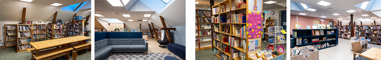 Placeringen på 4. sal, med skrålofter og synlige træbjælker, kombineret med varme farver på vægge og reoler, giver en lun og behagelig stemning i rummet.