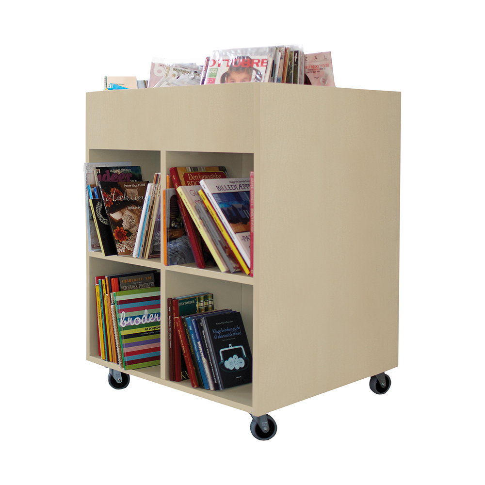 Sara Maxi er en billedbogskrybbe med fire eksponeringsrum øverst og otte opbevaringsrum nederst. Ideel til både børn og voksne.